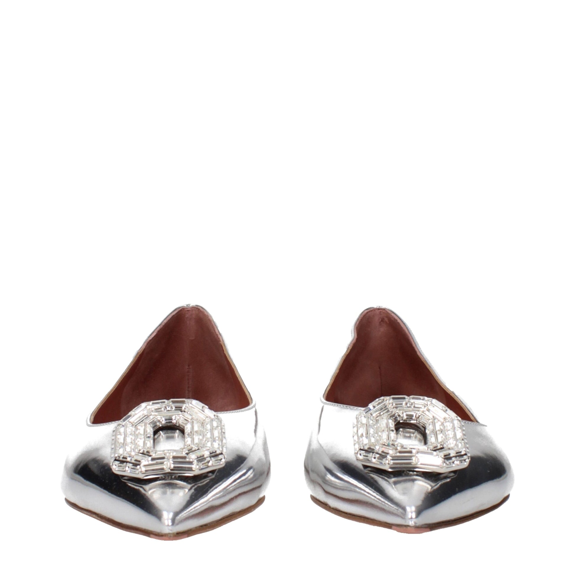 The product with MPN CAMELIAFLATMIRRORSILVER and code F84588 leather in silver is a ballet flats designed by Amina Muaddi. It has features like front detail, rhinestone.